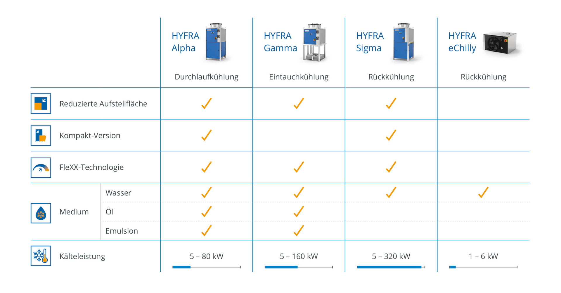 Die Prozesskühlung ist Bestandteil vieler Industrieanwendungen. Bei spannenden Verfahren wie dem Bohren, Fräsen, Drehen oder Schleifen ist sie unabdingbar für die Temperierung des Kühlschmierstoffs. Der Kühler senkt die Temperatur dieses Mediums, sodass es die Wärme bei der Bearbeitung zuverlässig aufnimmt und abführt. Der Kühlschmierstoff fließt entweder durch einen Durchlaufkühler wie den HYFRA Alpha oder ein Eintauchkühler wie der HYFRA Gamma taucht in das Kühlmedium ein. Beide Modelle kühlen Wasser, Öl oder Emulsionen und unterstützen so die Anforderungen verschiedenster Branchen – vom Maschinenbau bis zur Automobilindustrie.