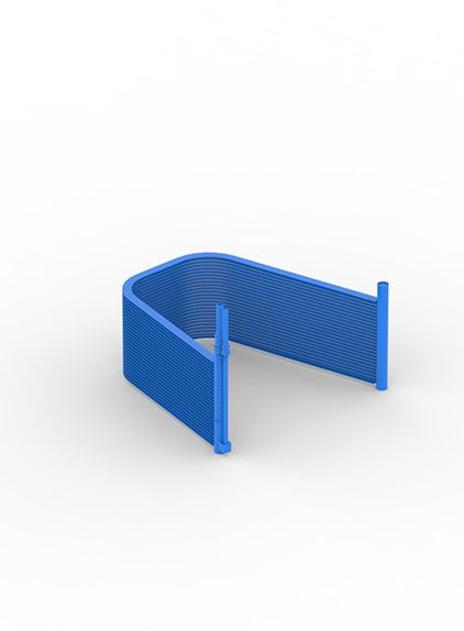 The large number of small μ channels (shown in blue) provides a significantly larger heat-exchanging surface than that of conventional evaporators. The sinus wave/fins (light gray area) which control the temperature of the emulsion or oil in the cycle, are cooled much more quickly. This makes the evaporation process more efficient. The small capillary diameter also requires significantly less refrigerant. From the very beginning, the 2-pass system of refrigerant distribution creates balanced refrigerant gas speed without negatively impacting gas pressure, which translates into even greater efficiency. The coating of the Microchannel also leads into higher resistance to chemical influences and prevents corrosion.